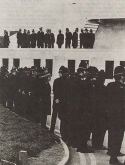 At 7:30am, 12 coaches full of police officers arived outside Whitefields opposite Senate House.[28] The total number of police was over 500.[29] The executive asked the police for 5 minutes while the occupiers gathered their possessions, which was largely a show of bravery as all possessions had already been collected together. None of the people explicitly named in the writ were present at the time, meaning no arrests were made. Moreover, the repossession order only applied to Senate House and so the police were unable to stop the students marching into the Arts Centre and beginning another occupation. Once the students had emptied out, the police conducted a search of the building and then left.